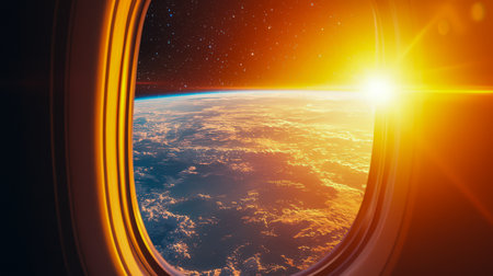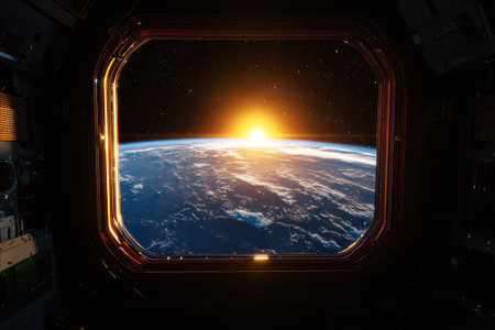 View of Earth from space through the window of a spacecraft or space station. Stunning orbital perspective showing clouds, continents, and the curvature of the planet. Elements of exploration, science