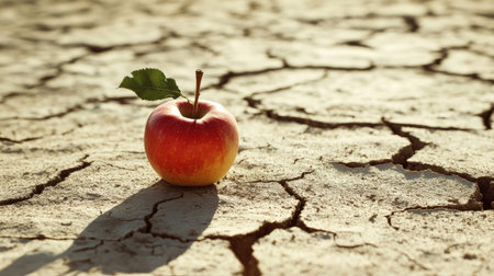 A striking red apple rests on cracked dry ground, highlighting the challenges of drought and climate change. This image symbolizes resilience and the need for sustainable agriculture.
