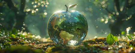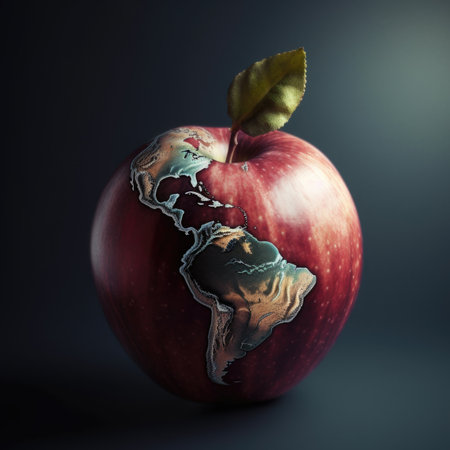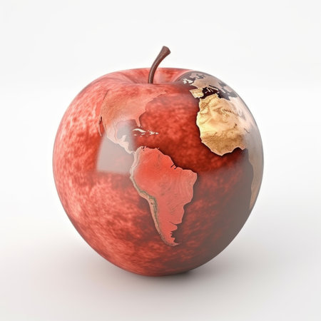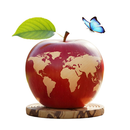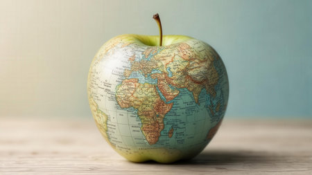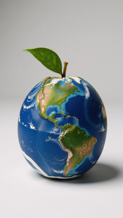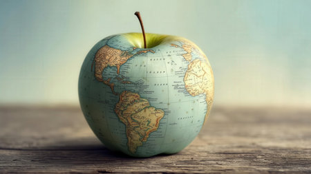 An apple etched with a world map, beautifully symbolizing global interconnectedness, environmental sustainability, and our collective responsibility for the planet. This vibrant image blends natures beauty with a powerful message of ecology and stewardshi