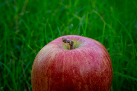 delicious natural apple lies in grass in early morning light - selective focus with excessive blur