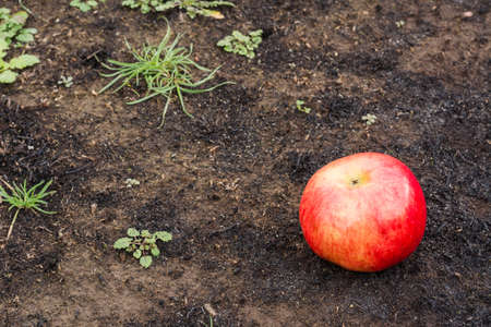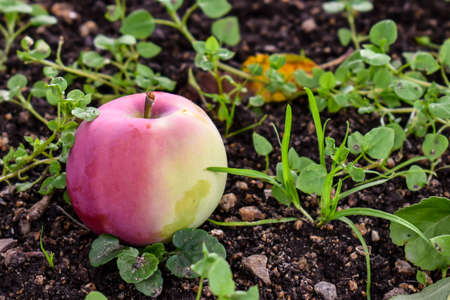 A beautiful young apple has fallen from the tree to the ground and lies on the grass in the garden. The concept of agriculture, harvesting, healthy food. Space for text. The apple lies on the ground