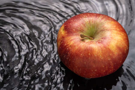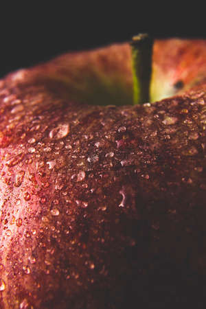 Red delicious apple macro photo with water drops, dark moody photo. Abstract fruit backgrounds