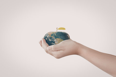An image of a pair of hands gently holding a small globe with a leaf on top, symbolizing environmental care and sustainability.
