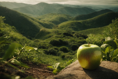 Red apple with leaves is standing on a rock in front of a mountain landscape