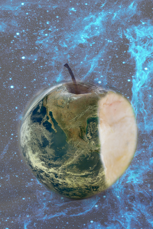 The world as a core in a giant apple, sitting in an otherworldly orchard