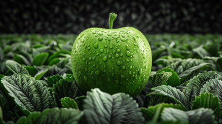 A green apple with water droplets glistening, placed on a layer of dewy leaves under morning sunlight.