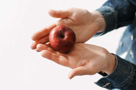 A hand holding an apple against white background. Salvador, Bahia, Brazil.