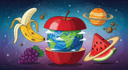A stylized depiction of Earth as a fruit with intricate oceanic details atop a leafy stem