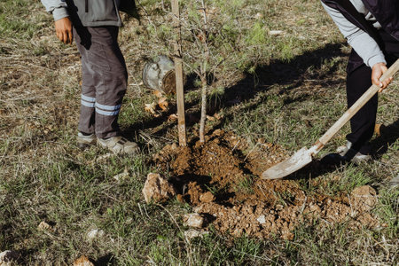 Shallow depth of field (selective focus) image with an oak sapling during an autumn tree planting.