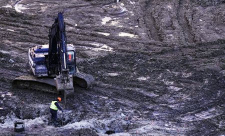 A dedicated construction worker is seen expertly handling muddy terrain at a construction site. Dressed in a helmet and work gear he kneels close to the ground focused on his task as he uses his hands to manipulate the wet soil. The surrounding area shows signs of ongoing construction with machinery in the background and orange barriers marking the site