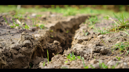 A close up image of a deep crack in dry soil. The crack is narrow and runs through the center of the image. The soil is brown and rough, with some grass growing on the edges of the crack.