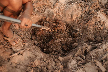 Man plants a small tamarind tree, hands holds shovel digs the ground garden. Farm and argiculture at countryside concept.