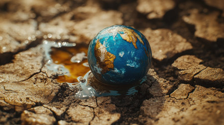 A melting globe with water dripping onto cracked soil, representing the impact of global warming on freshwater resources and drought. --chaos