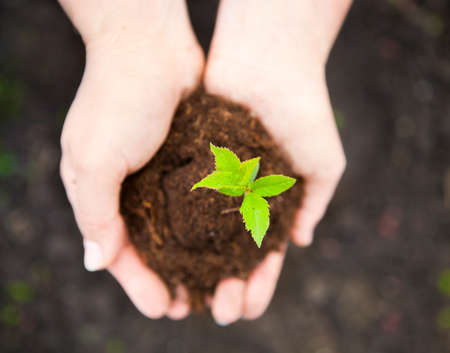 Woman holding young plant in hands against the soil background. Ecology concept. Close-Up