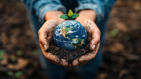 Hands cradling the Earth with a growing seedling, symbolizing environmental conservation and sustainable growth.