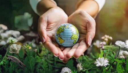 Delicate hands hold a small globe while surrounded by lush greenery and colorful flowers, highlighting a connection to nature and the world.