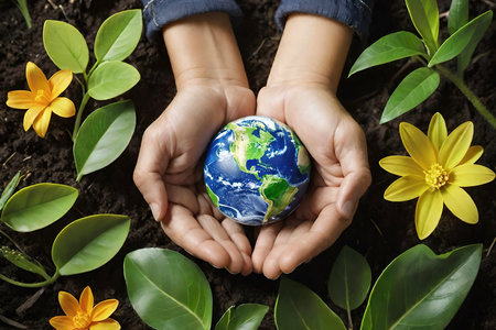 Hands holding a small Earth with green sprouts growing from it, representing ecological responsibility generative ai
