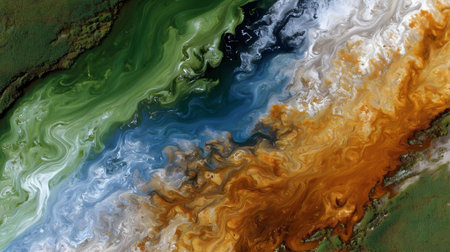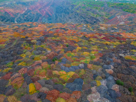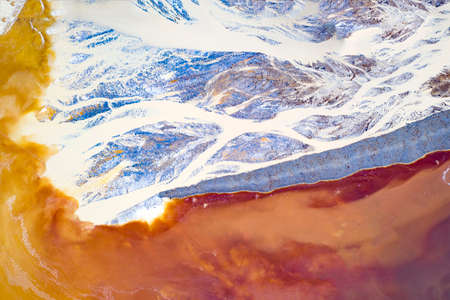 Beautiful aerial pattern of colorful water and mud, shot with a drone located at Geamana, Romania, a formerly village that was covered with toxic waste from a mining operation nearby.