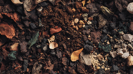 An artistic arrangement showcasing beautiful textures of earth, clay, and soil, accented by vibrant autumn leaves. Ideal for nature-inspired designs.