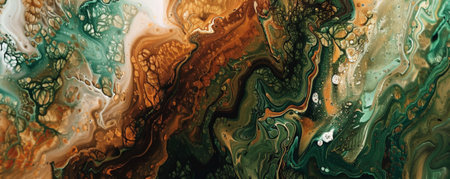 Liquid acrylic paint in earthy tones of brown and green, forming a natural, swirling texture. The colors merge and separate, creating intricate patterns and rich contrasts.