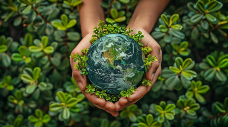 Hands holding a small Earth with green sprouts growing from it, representing ecological responsibility generative ai