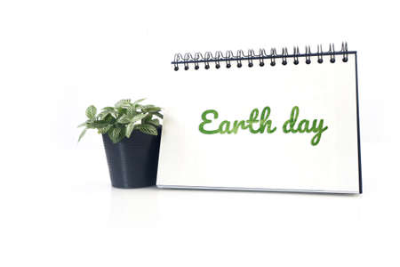 Green earth day text on Desktop calendar and small garden tree on flowerpot on isolated white background.