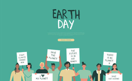 Earth day web template illustration of diverse people in environment protest or parade. Social background for nature event, men and women protester holding activist sign with green planet quotes.