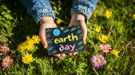 A close-up of a chalkboard label with 'Happy Earth Day' text rests on a rock against a serene natural landscape, echoing a message of environmental celebration and Earth consciousness