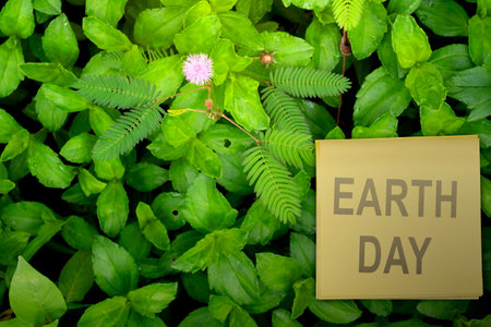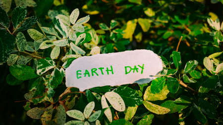 earth day concept, earth day word written on a paper with nature green plant background