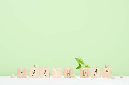Earth day background - young peas sprout with lettering on wood cubes, seeds on white wood table.