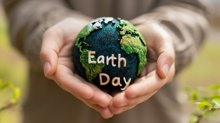 Closeup of hands cradling a globe with the Earth Day Text