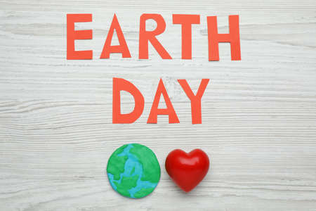 Words Earth Day, plasticine planet and decorative heart on white wooden table, flat lay