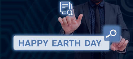 Handwriting text Happy Earth Day. Business concept Worldwide celebration of ecology environment preservation Businessman With Two Hands Searching For Important Data And New Ideas.