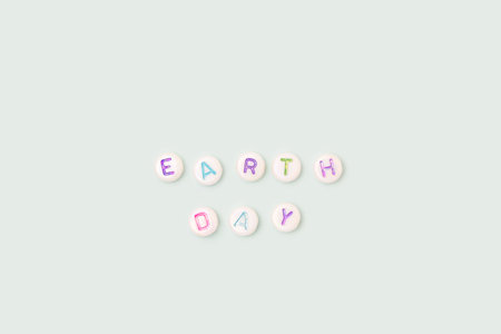 Earth Day. Quote made of white round beads with multicolored letters on a blue pastel background.