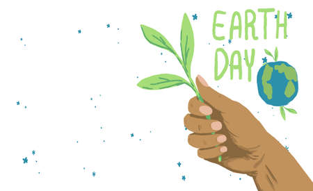 Earth day poster with copy space on white backdrop. Hand holds green twig symbol for invitation or gift card, social banner. Phone case or cloth print art. Hand drawn style stock vector illustration