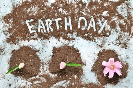 Soil and flowers on light background. Earth day celebration
