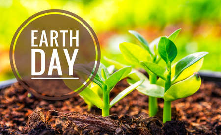 Earth day logo with Young plant growing over blurred garden
