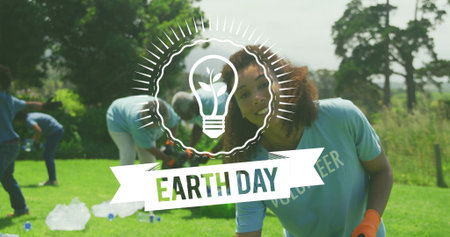 Composition of green globe logo and earth day text over cheering volunteers cleaning up countryside. global conservation and earth day concept digitally generated image.