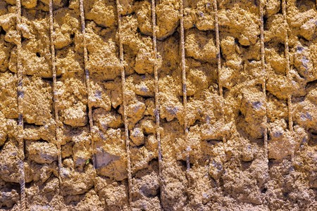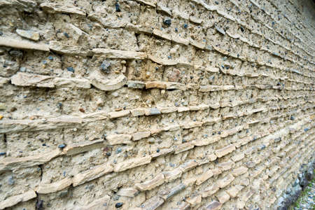 Close up of an earthen wall made of compacted mud and straw.