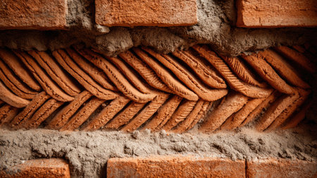 Captivating close-up of an intricate clay relief design on a brick wall, featuring unique textured patterns and showcasing exceptional craftsmanship in warm earthy tones.