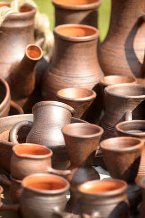 Ceramic products, traditional handmade souvenirs on the table. Crafts Fair. Selective focus