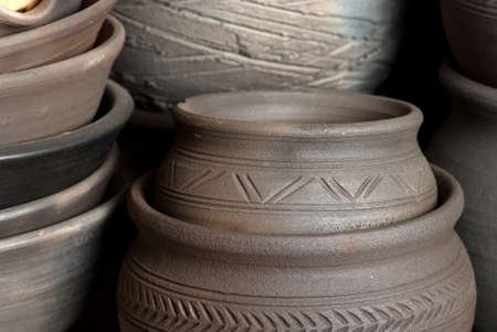 Shelves with bowls, plates, jars, teapots, etc. made in clay in natural raw color until the final painting. Crafts in clay. Close-up.