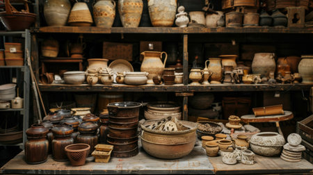 A charming array of handmade clay pottery arranged on rustic wooden shelves, showcasing the beauty of craftsmanship and the warm tones of earthen materials in a cozy workshop setting.