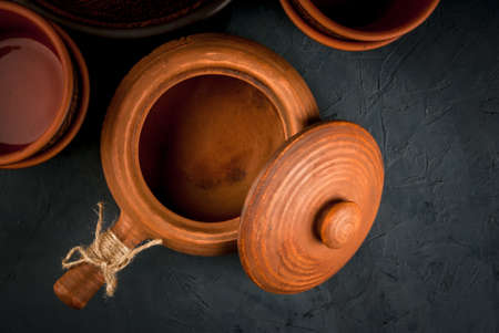 Clay rustic dishes on a stone table: pot (pan), plates and gravy boat, top view copy space