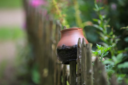 Traditional Slavic decor in village. Clay vintage terra cotta water pot on wooden fence at countryside. Rural landscapes.