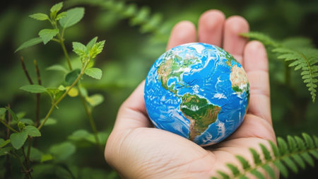 A vibrant earth globe rests among lush green leaves, symbolizing nature's beauty and the importance of environmental conservation in a thriving ecosystem.