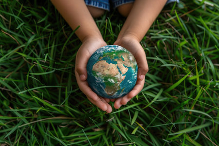 A close-up captures hands cradling a small Earth globe nestled in soil with a growing plant. The image displays a shallow depth of field, natural lighting, and a soft focus. It evokes themes of environmental care, conservation, and sustainability. Suitable for use in editorial content and various commercial applications.