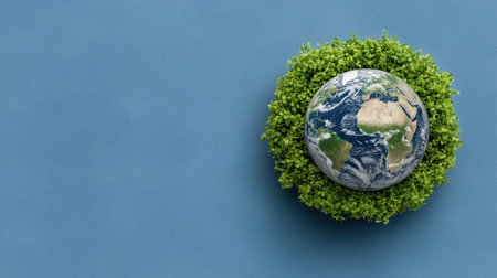 A captivating image of the Earth globe surrounded by vibrant green leaves, set against a striking blue background. Perfect for themes of nature, sustainability, and global awareness.