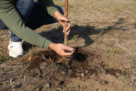 Removing a seedling from a pot. Planting a tree in the ground. A man prepares a plant for planting in the ground. Planting new trees in the park.
