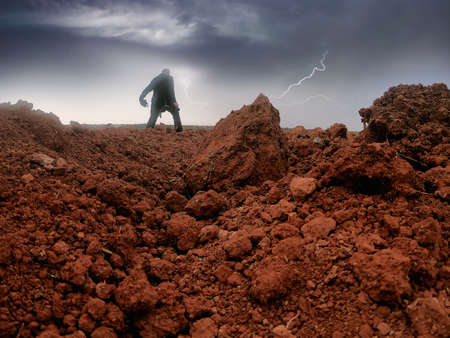Man standing on soil dry land cracked ground surface. Black landscape dried and cracked background. dark drama concept.